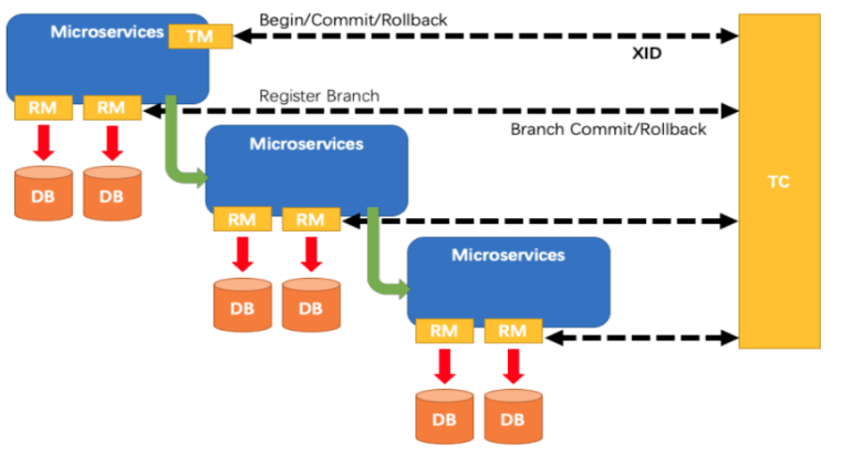 - Transaction Coordinator(TC) : 事务协调器,维护全局事务的运行状态,负责协调并驱动全局事务的提交或回滚