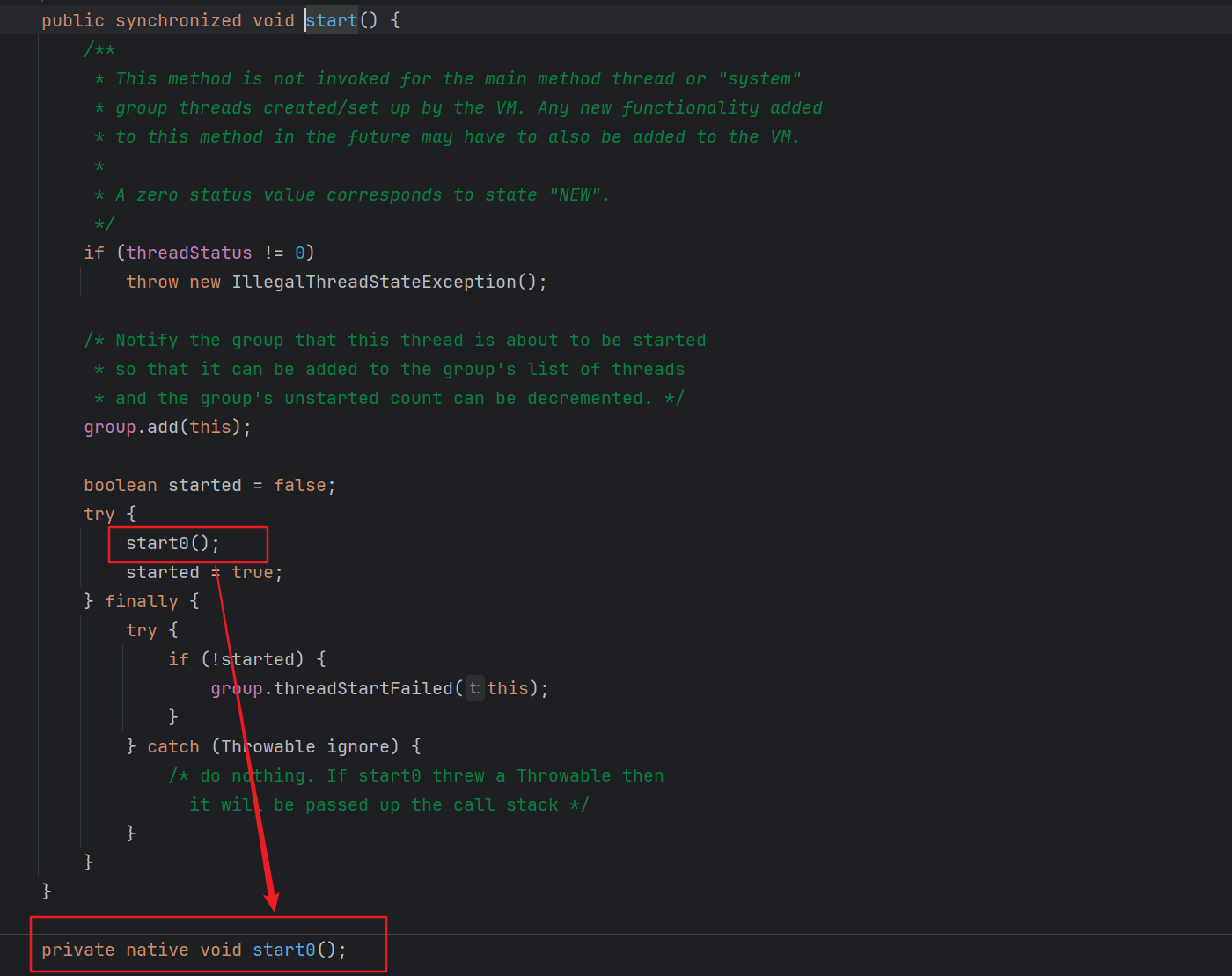 查看Java源码文件Thread.java,start方法中是调用了start0,到了private native void start0()就结束了